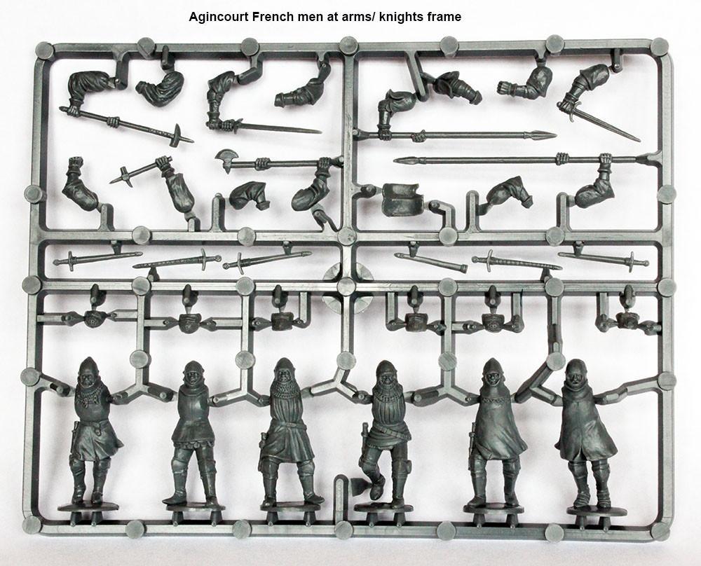 The set consists of 36 plastic French Infantry and 6 knights/men at arms. The infantry are armed with spears, crossbows, double handed axes and hand weapons. The knights have cut-down lances/spears, pole arms and swords.