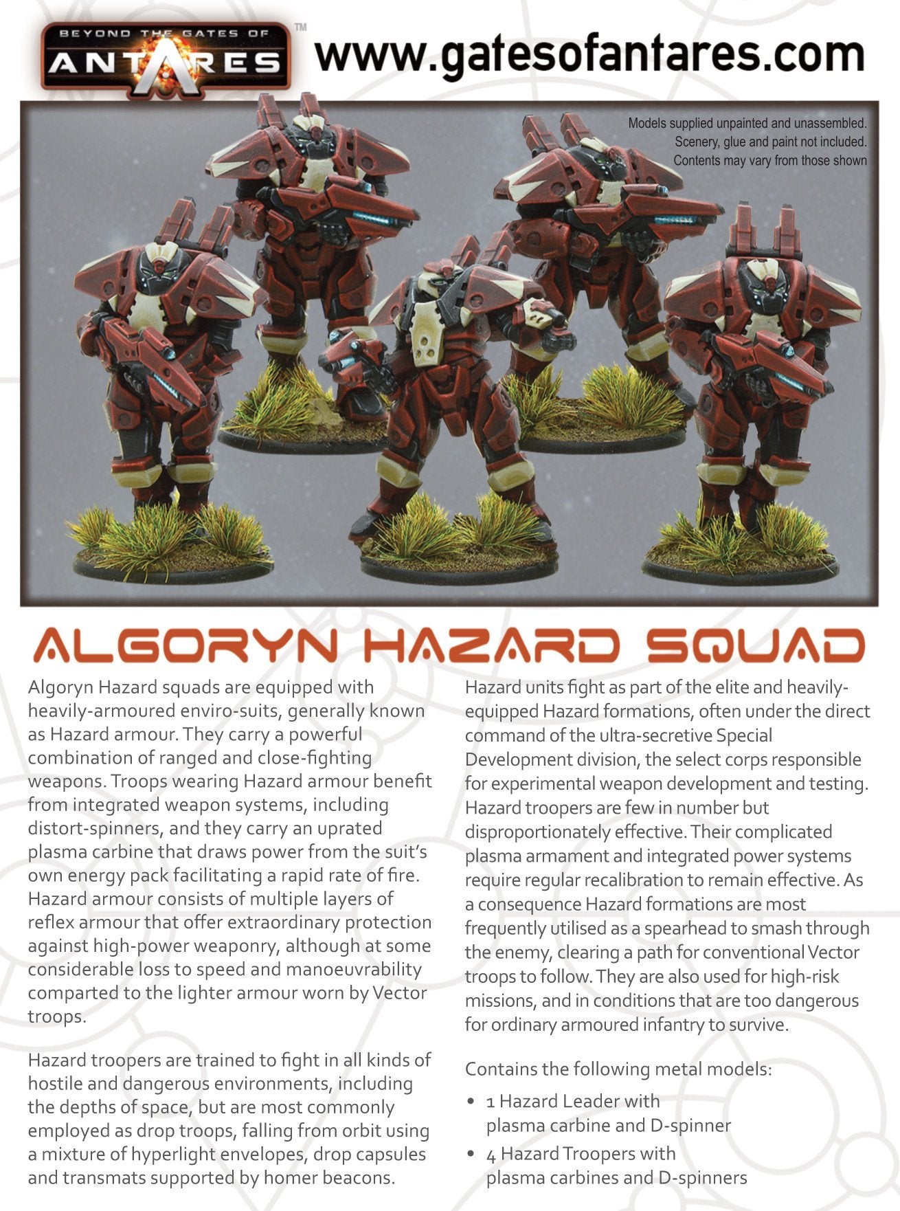 Algoryn Hazard squads are equipped with heavily-armoured enviro-suits, generally known as Hazard armour. They carry a powerful combination of ranged and close-fighting weapons. Troops wearing Hazard armour benefit from integrated weapon systems, including distort-spinners, and they carry an upgrated plasma carbine that draws power from the suit’s own energy pack facilitating a rapid rate of fire.