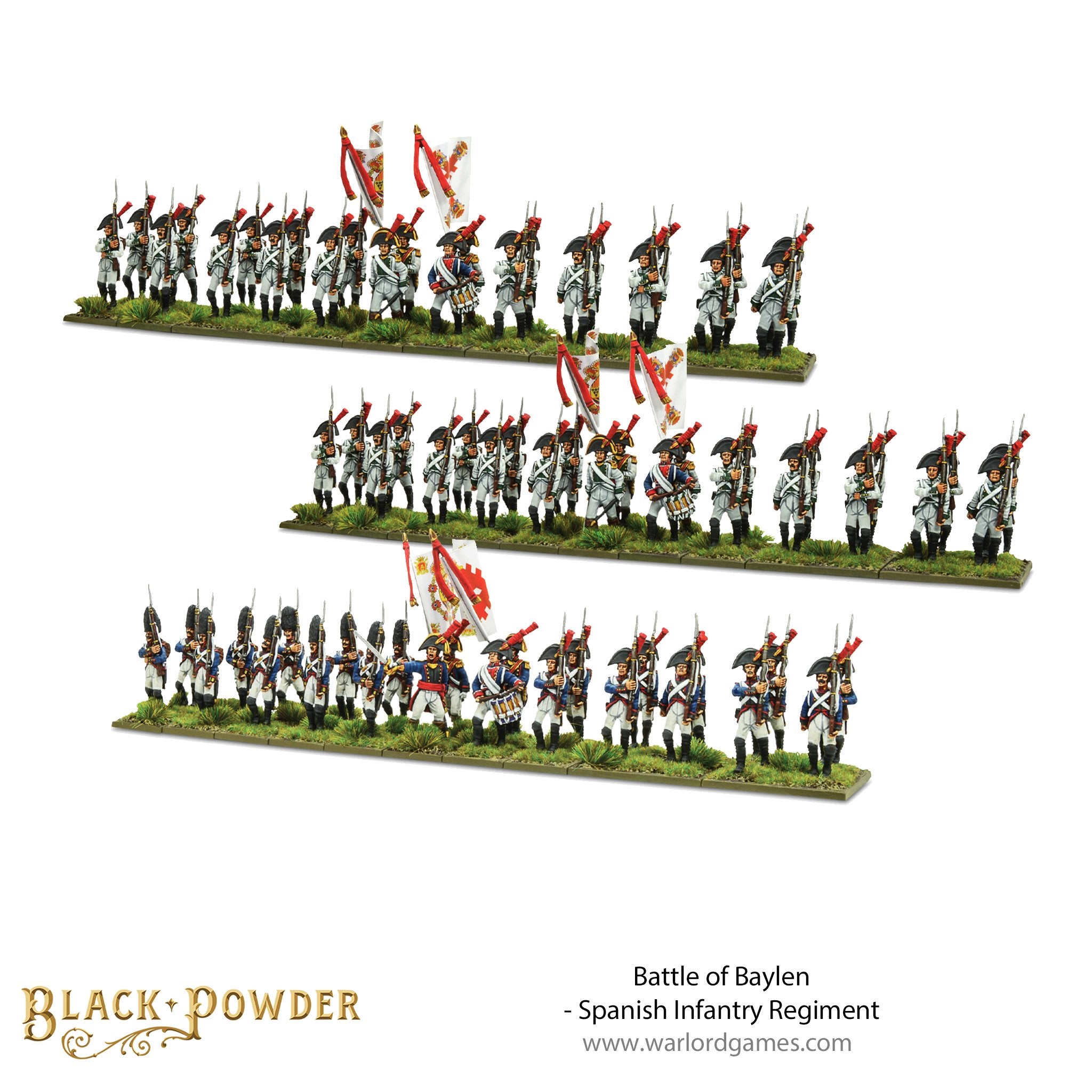 Most regiments had two battalions – the first composed of half of grenadiers and half of fusiliers with one flag, the Coronela; the second and third battalions were composed entirely of fusiliers carrying the distinctive Sencilla (or Ordenanza) white flag with red bourbon saltire. We know many gamers like to field two flags in a battalion no matter what history says so we’ve included two ensign figures per battalion. If you are more historically minded, we’ve added an extra fusilier (Shhh, don’t tell the boss…) free of charge for each of the three battalions!