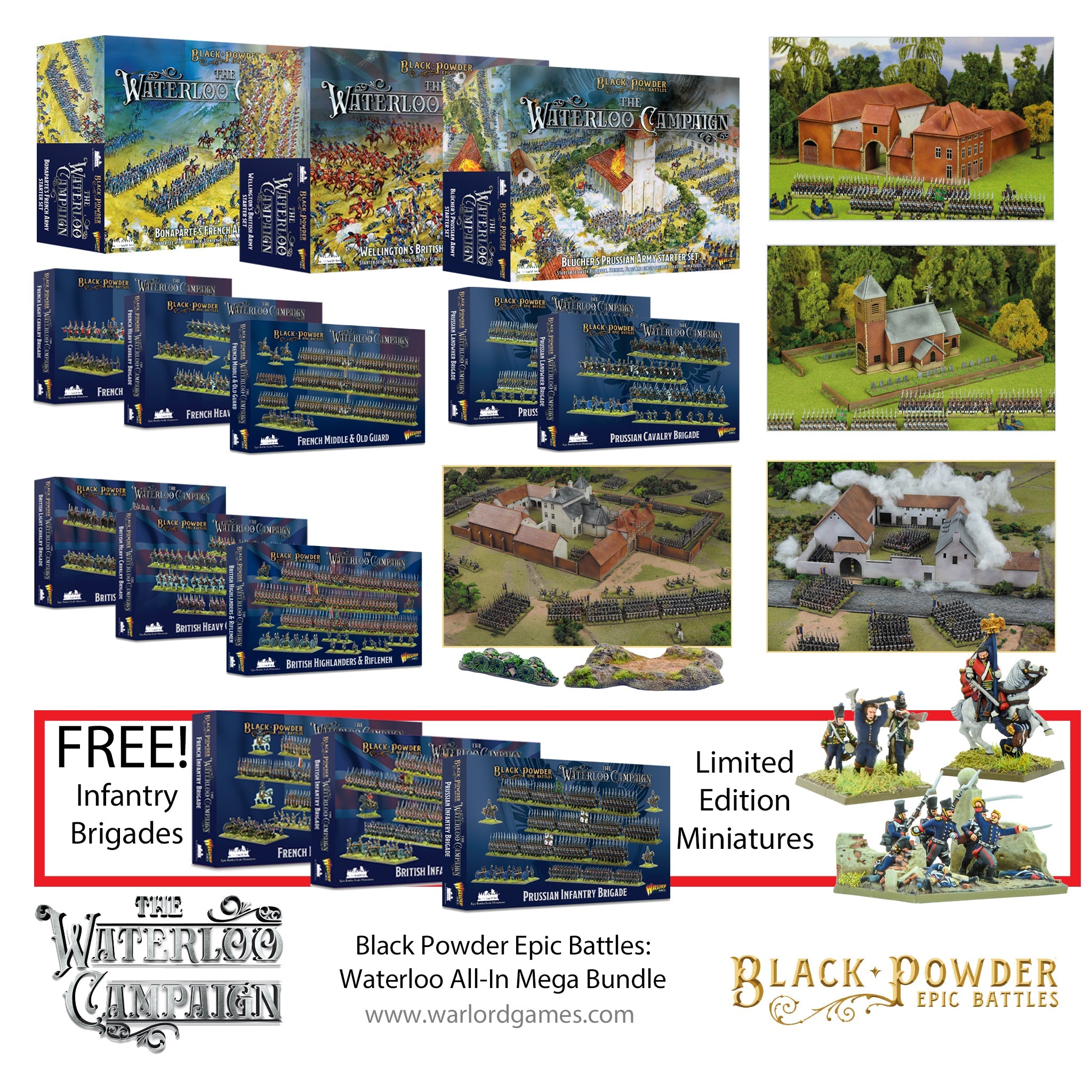 This is the ultimate Epic Battles: Waterloo bundle, designed for collectors who want to refight the battle in its most complete form. It contains one of every starter set, plastic boxed set and named scenery set released thus far for the game including those pertaining to the long-awaited Prussian Army.