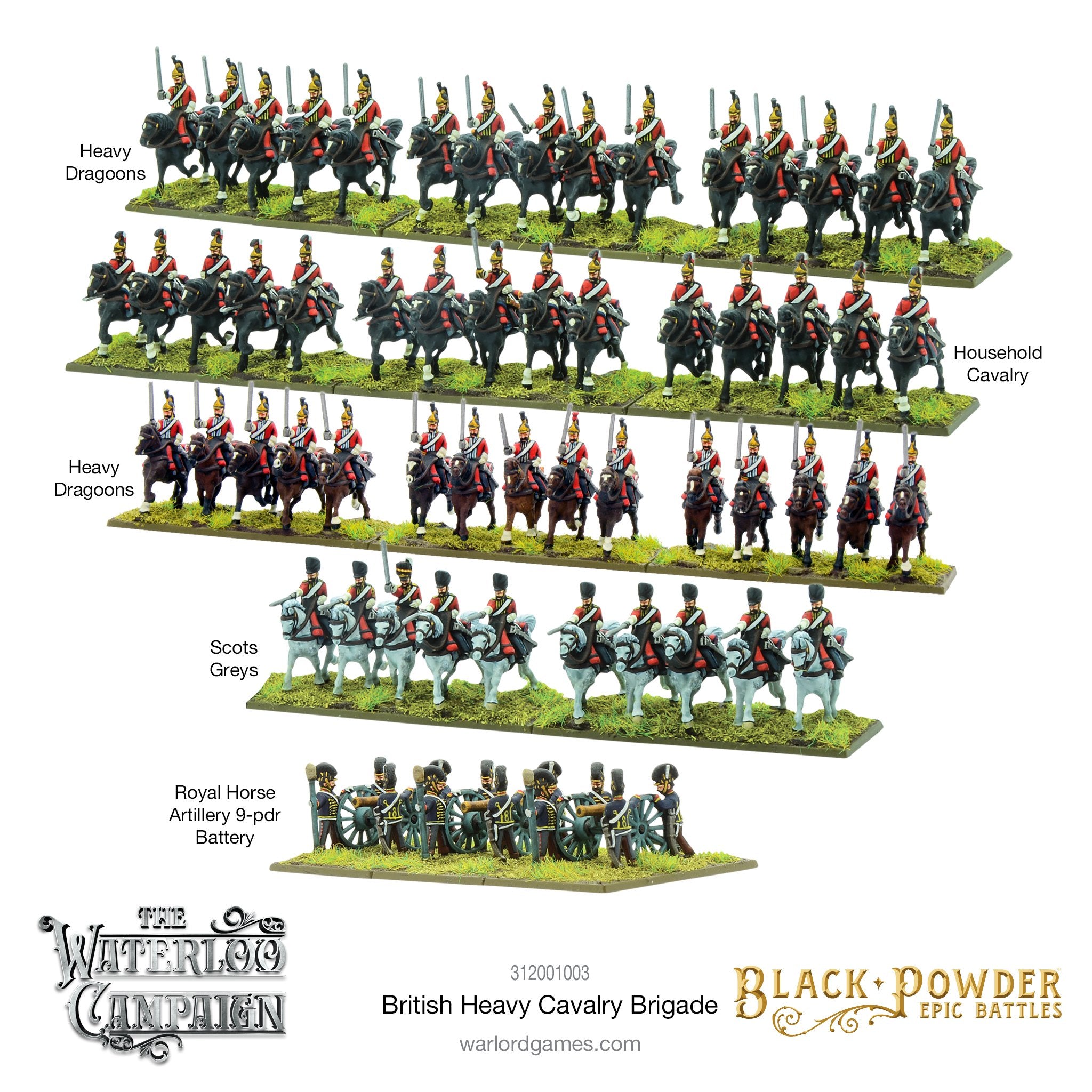 Arguably the best shock cavalry of the period, the British heavy cavalry showed great bravery but poor control on the day of Waterloo. These heavy cavalry smashed the French columns to pieces but, due to their poor leadership, they were destroyed by the French in turn. There were two heavy cavalry brigades, the Household division with four regiments and the Union Brigade with three. To give close support the Royal Horse Artillery attached to them field fast-moving, deadly 6-pounder guns. Sound the charge!