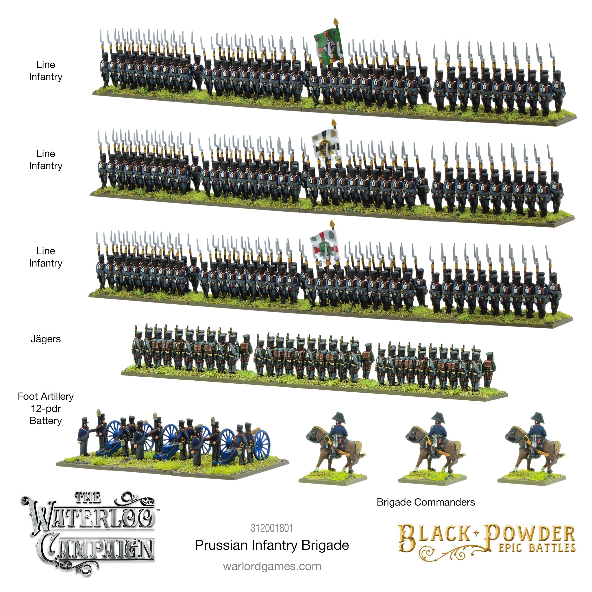 This plastic set provides enough models to field a complete brigade of three Prussian line or light infantry regiments of 80 men each, three bases of jägers, a 3-gun Foot Artillery 12-pdr battery and three mounted brigade commanders.