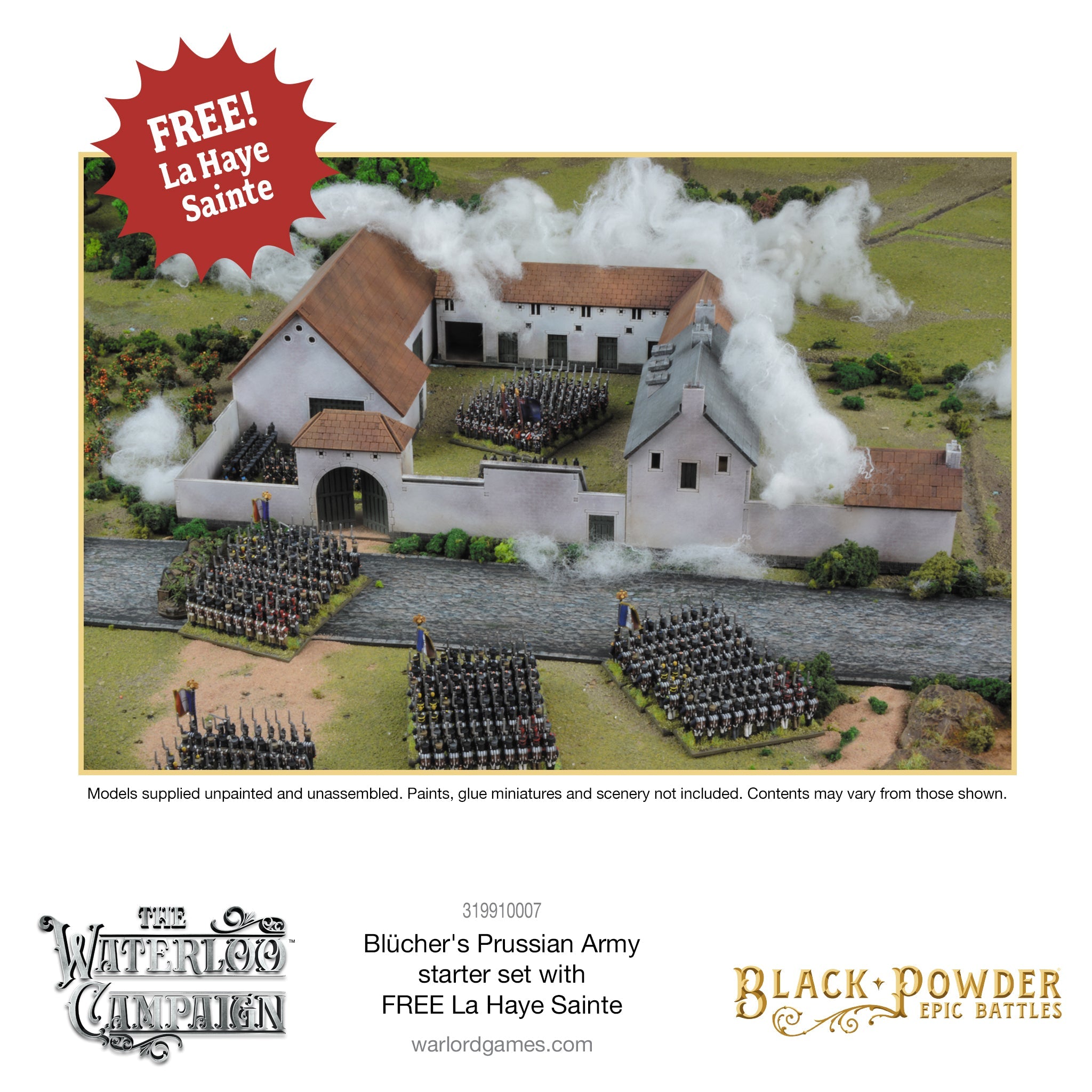 This bundle contains an Epic Battles: Waterloo British Starter Army and a FREE La Haye Sainte Farmhouse!