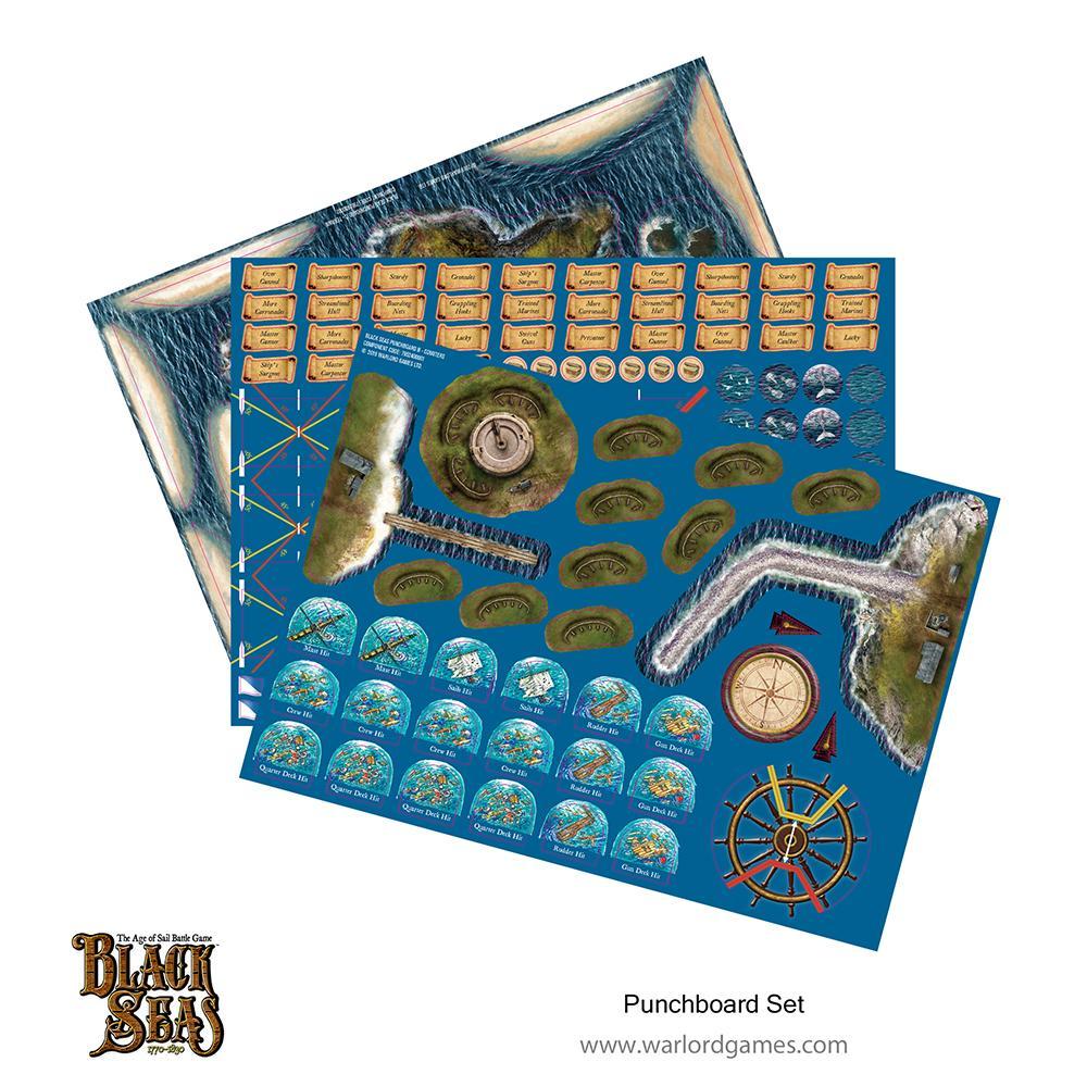 The Black Seas punchboard has all you need to represent game effects, such as damage to ships, upgrades and shooting effects. Also included are movement and turning templates.