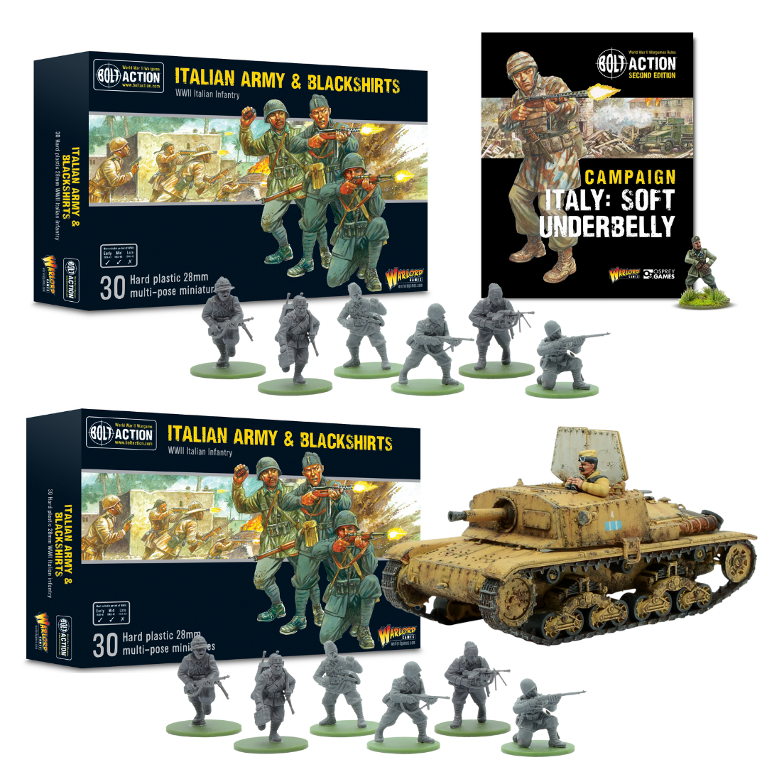 This bundle features two boxes of our brand-new plastics netting you 60 miniatures – with copious weapons options as well as the ability to represent Blackshirts – suitable to represent Italian troops in a wide variety of World War Two theatres. This bundle also includes the recent plastic kit that will build either a Carro Armato or Semovente. This bundle really is the easiest way to customise a brand new Italian Army – it will only be available whilst pre-orders are ongoing.