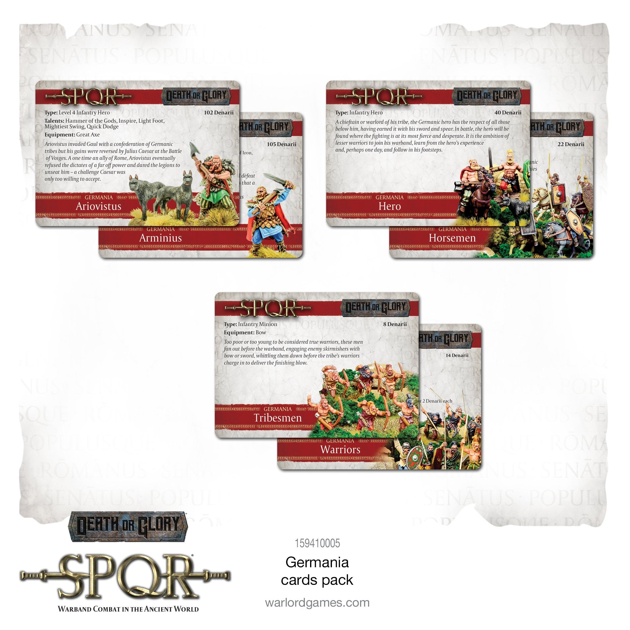Available for a limited time only, this card pack contains all the updated game cards for the Death or Glory SPQR Germania faction. The game cards are a convenient reference for rules and denarii values whilst playing.