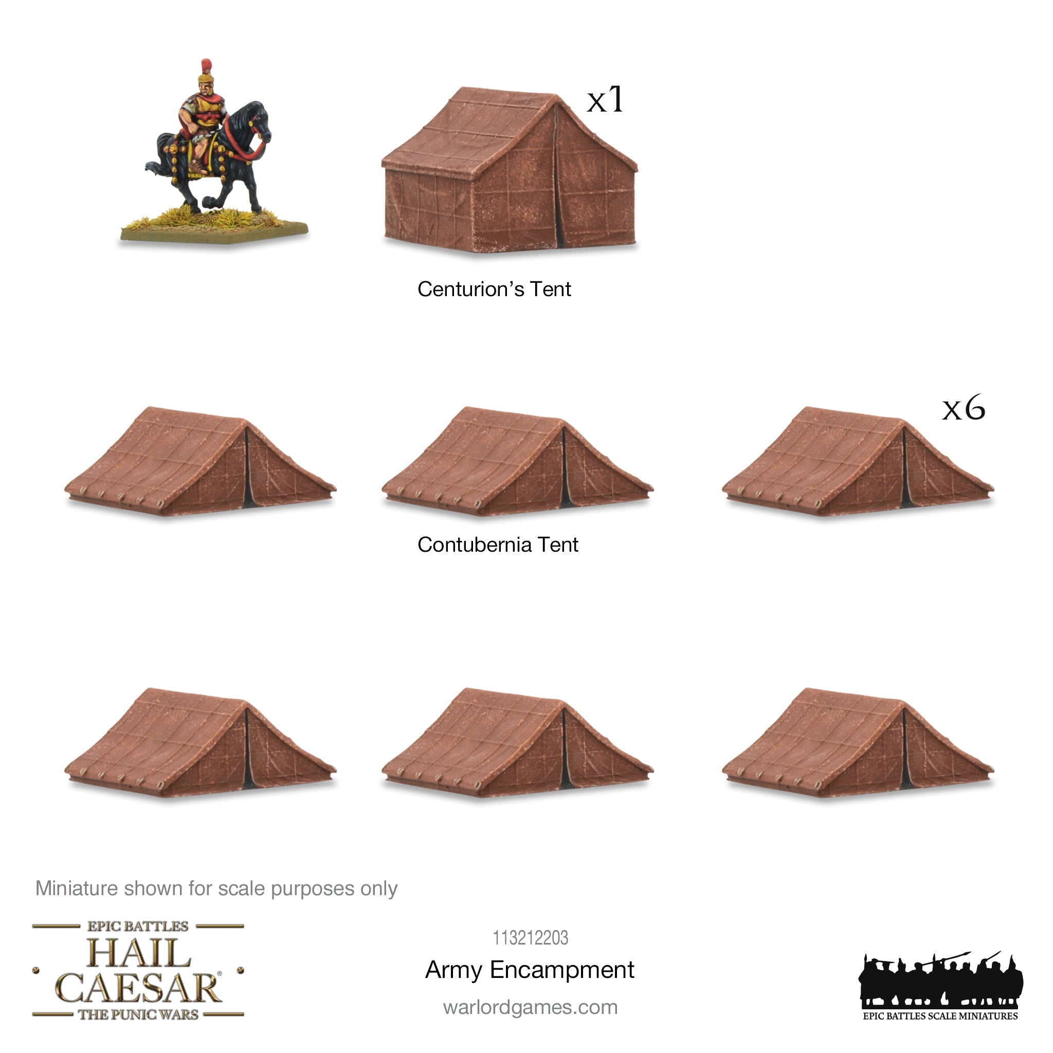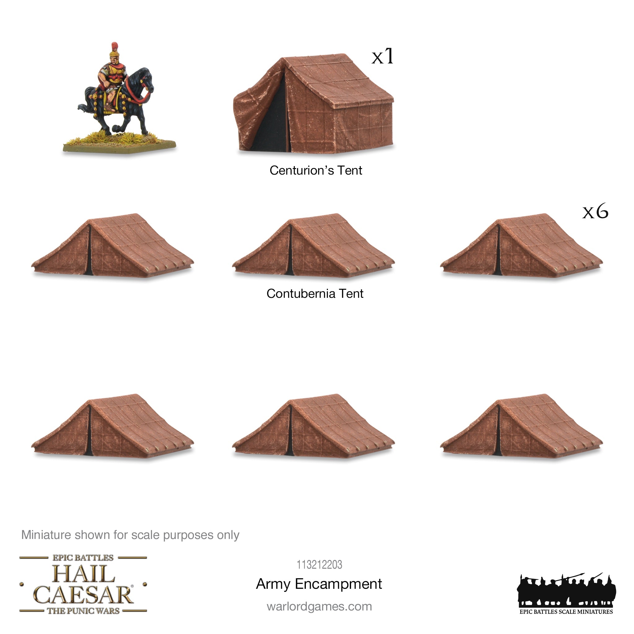 Pack contains one Centurion’s Tent and six Contubernia Tents, cast in Warlord Resin.