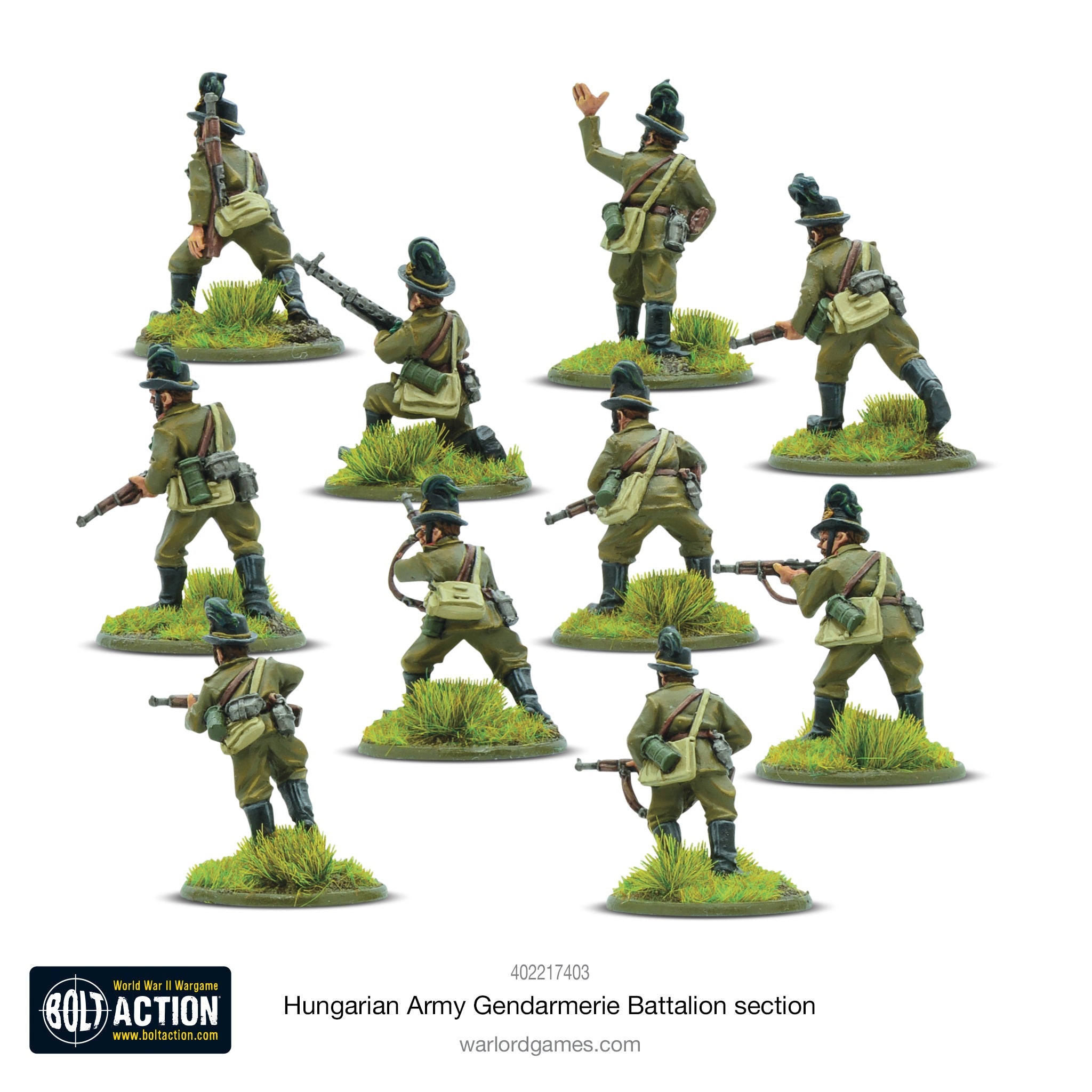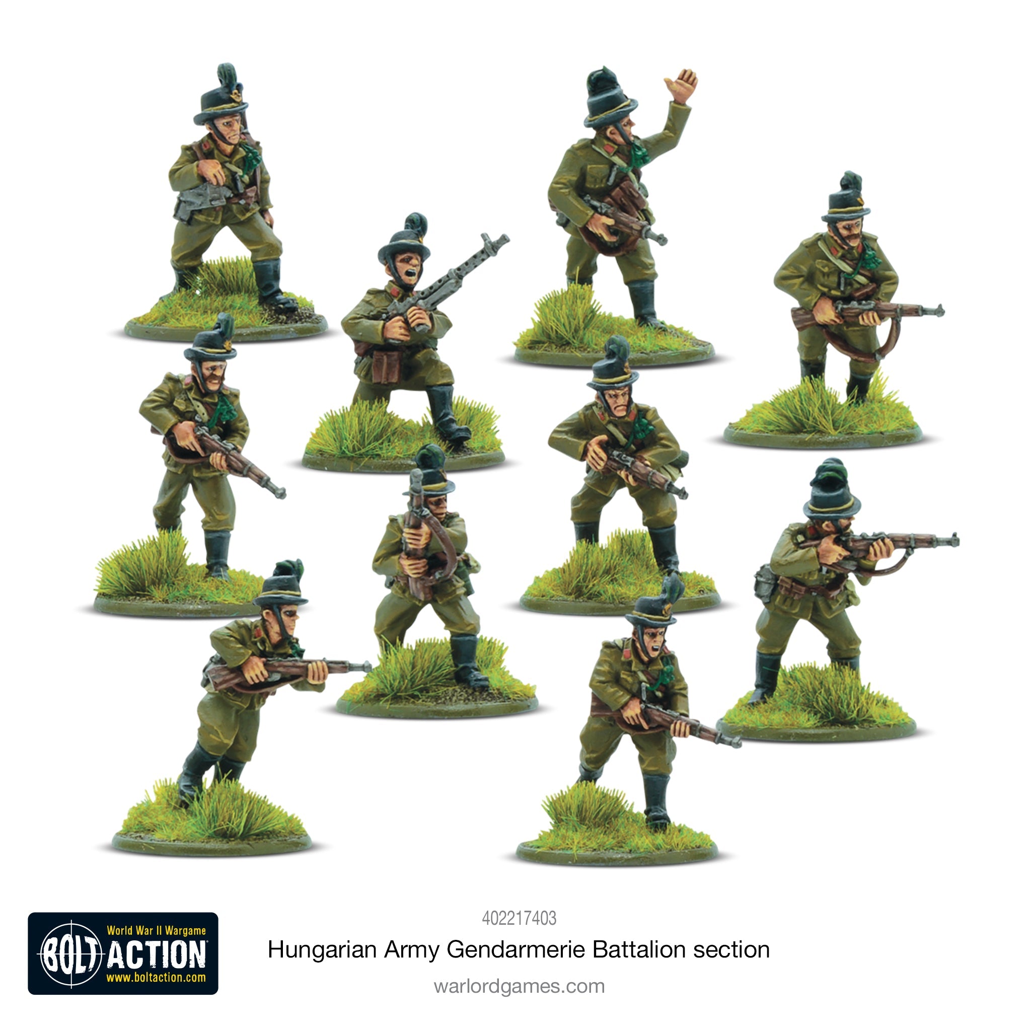 The Hungarian Gendarmerie, or Csendőrség, was a paramilitary force intended to maintain law and order, particularly in rural areas. With Hungary's entry into the Second World War, they would be increasingly deployed in support of the regular army, fighting under their motto “Híven, Becsülettel, Vitézül” (faithfully, honorably, valiantly). Equipped much the same as their regular counterparts, with the exception of their feather-trimmed bowler hats, they're a great option for the Hungarian player looking to add some variety to their Rifle Platoons!