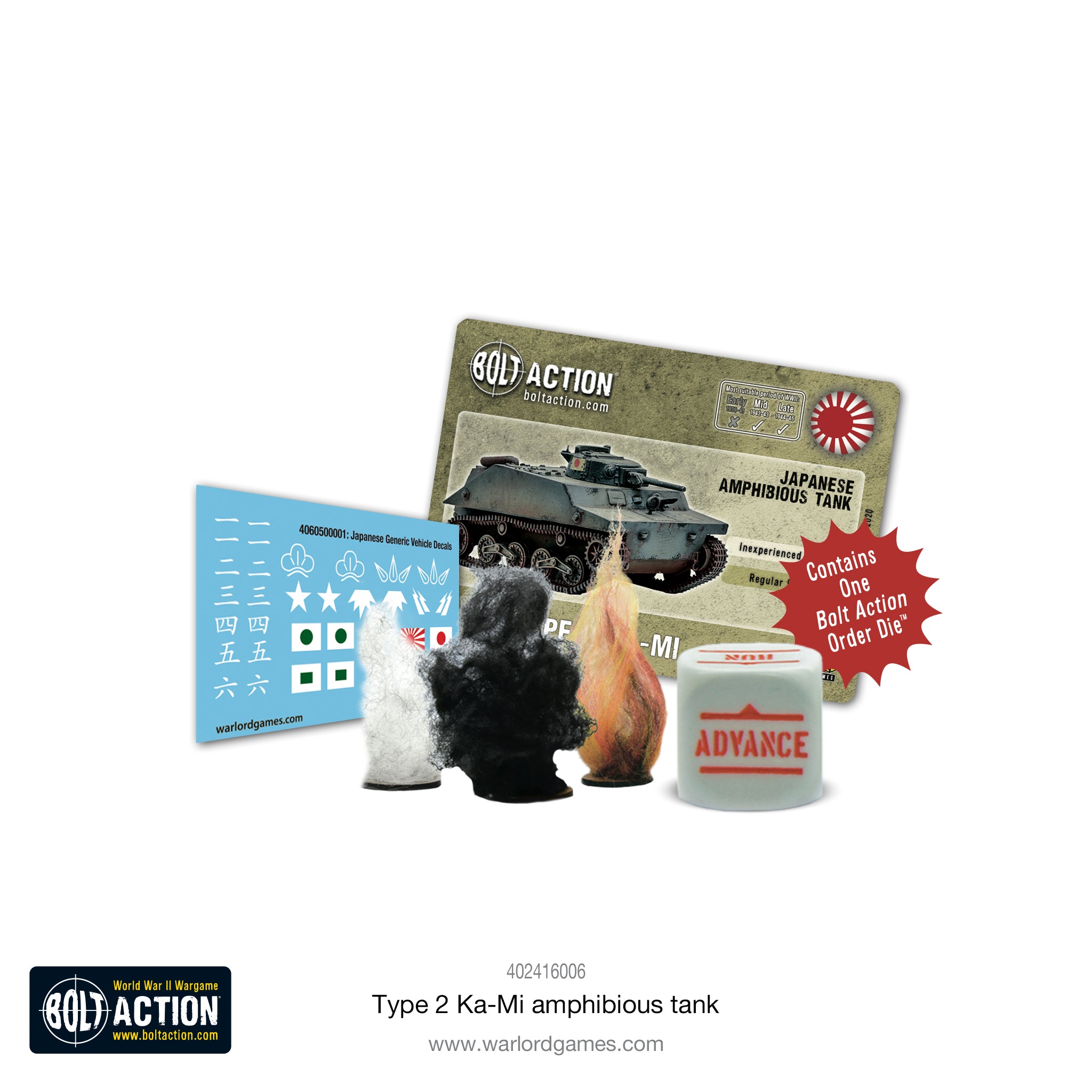Contains one resin and metal amphibious tank, Bolt Action stat card, vehicle damage markers, full colour waterslide decals, Bolt Action order die.