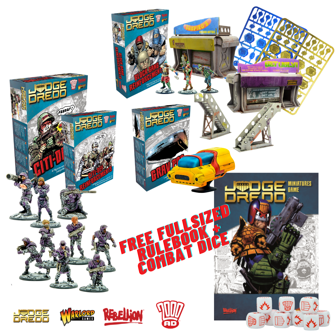 With this awesome bundle deal, you can get your hands on everything you need to start playing Judge Dredd the miniatures game - Ideal to grab if you're gaming buddy already has the core set and you don't want to double up on miniatures - it also builds perfectly on the core set with the Block Gang Reinforcements to enhance your block gang and the Citi-Def to fight side-by-side with your judges.
