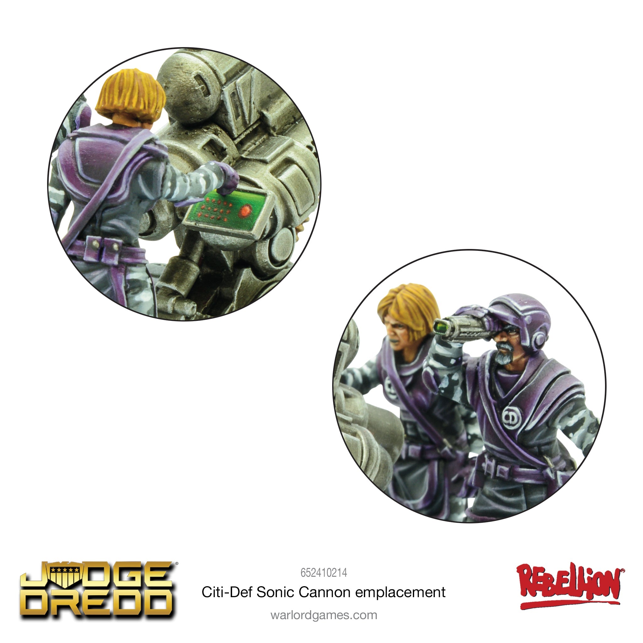 Only mounted on vehicles and semi-mobile emplacements, the sonic cannon is a massive weapon intended to incapacitate large crowds through ultrasonic waves causing nausea, shortness of breath, or even more unpleasant results. Found in the armouries of both the Justice Department and the Citi-Def, its only real purpose is to be used against the citizens of Mega-City One.