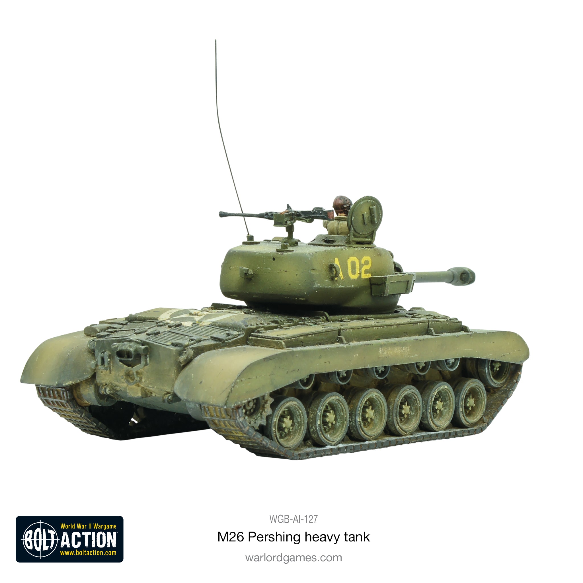 Box contains one resin and metal M26 Pershing heavy tank, Bolt Action Order Dice, waterslide decals, Bolt Action: Third Edition stat card, and Achtung Panzer! Tank Datacard and tokens.