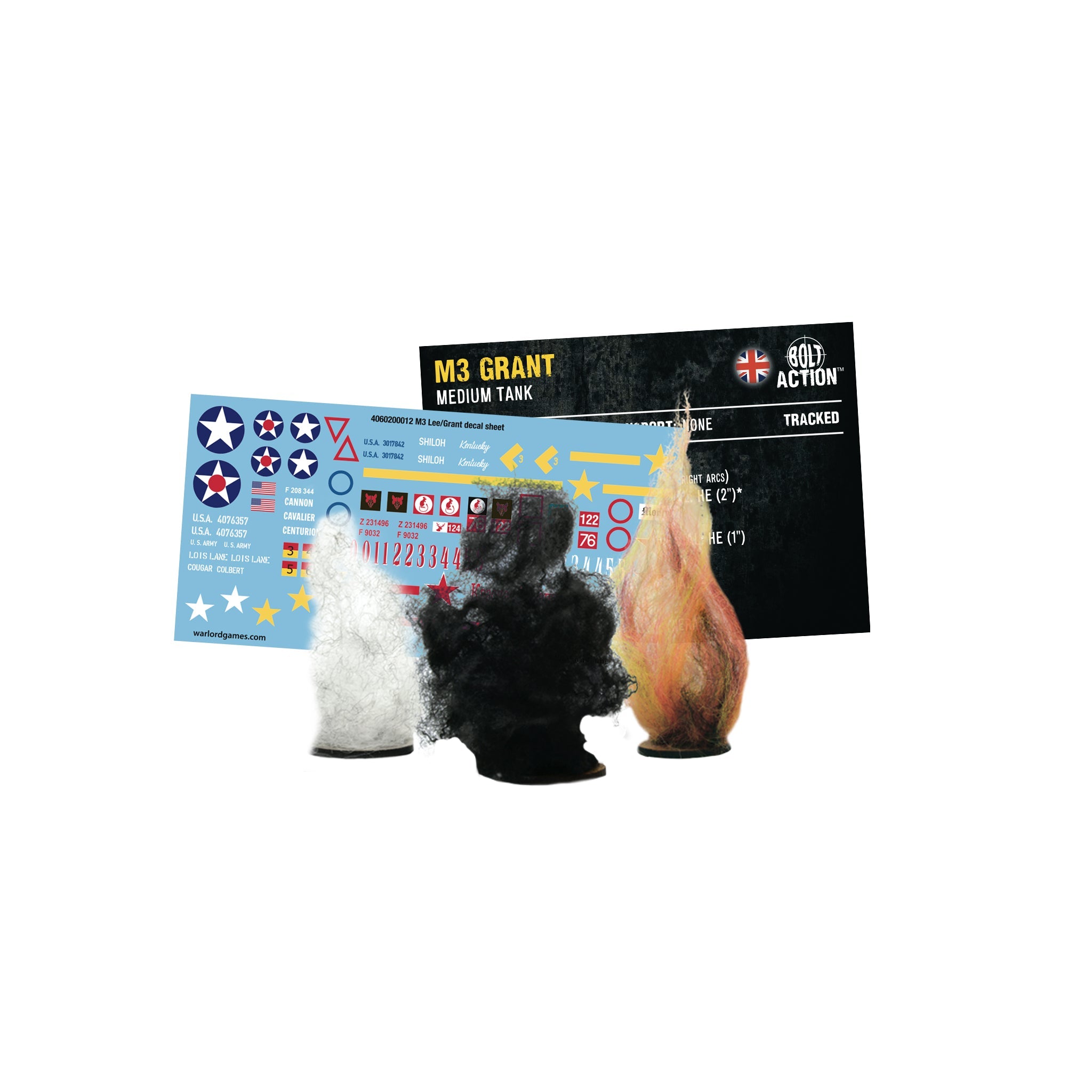 Box contains one plastic M3 Grant medium tank, decal sheet, Bolt Action vehicle stat card, and vehicle damage markers.