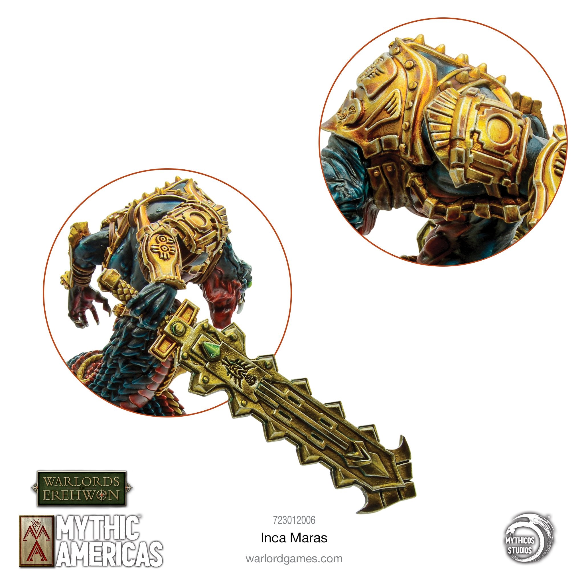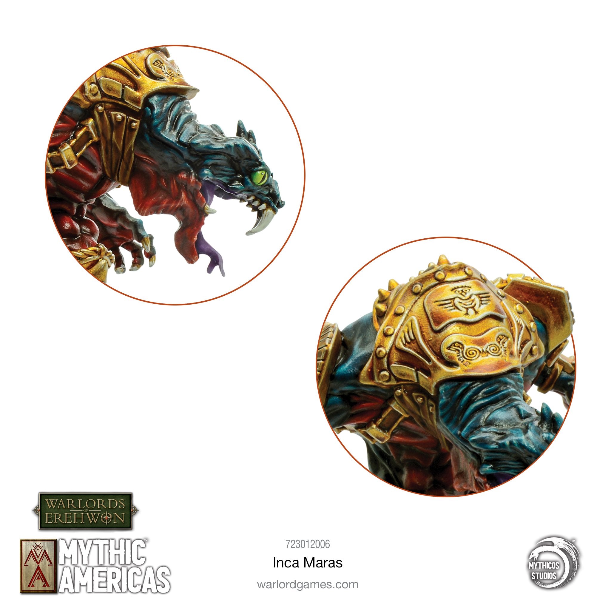 A monstrosity choice for an Inca army, the Maras is a flexible unit able to attack directly with a large weapon for a small number of high SV attacks or with many lighter attacks with its tail swipe.