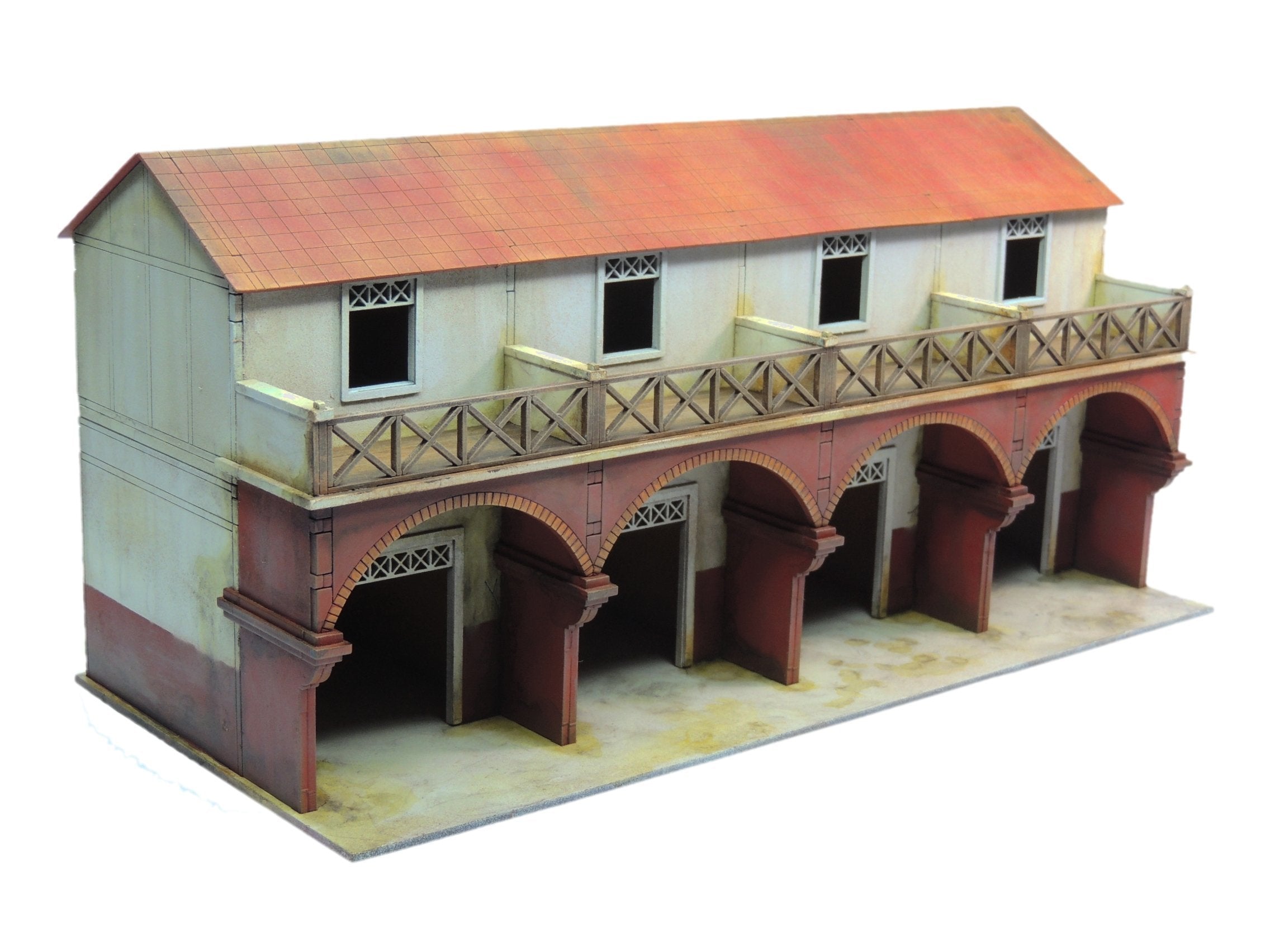 The terrain is made from MDF and is part of the Streets of Rome range. 133mm x 295mm x 140mm high. Hight to balcony 70mm