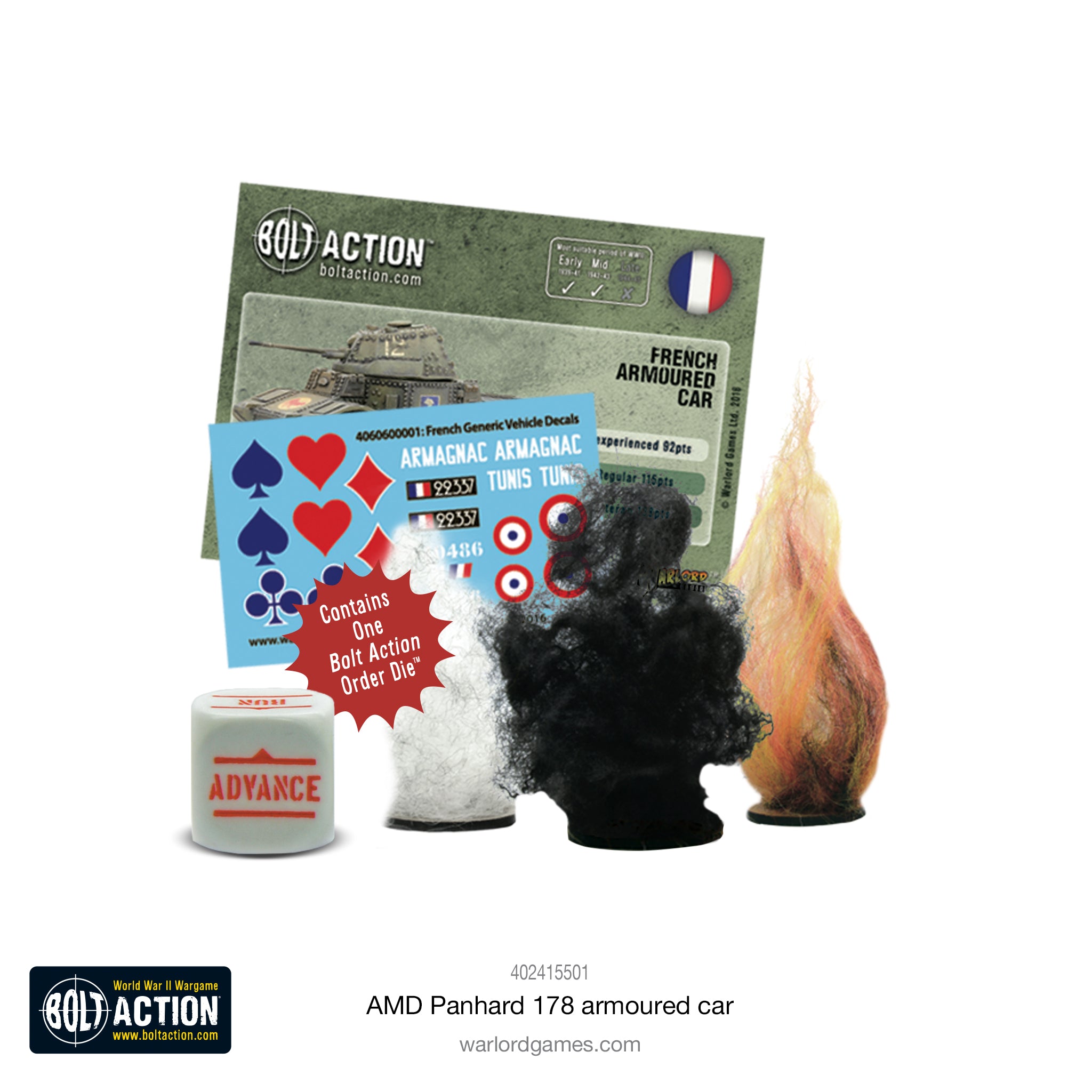 Contains one resin & metal Panhard 178 armoured car with metal tank crewman, stat cards, damage markers, decal sheet and order dice.