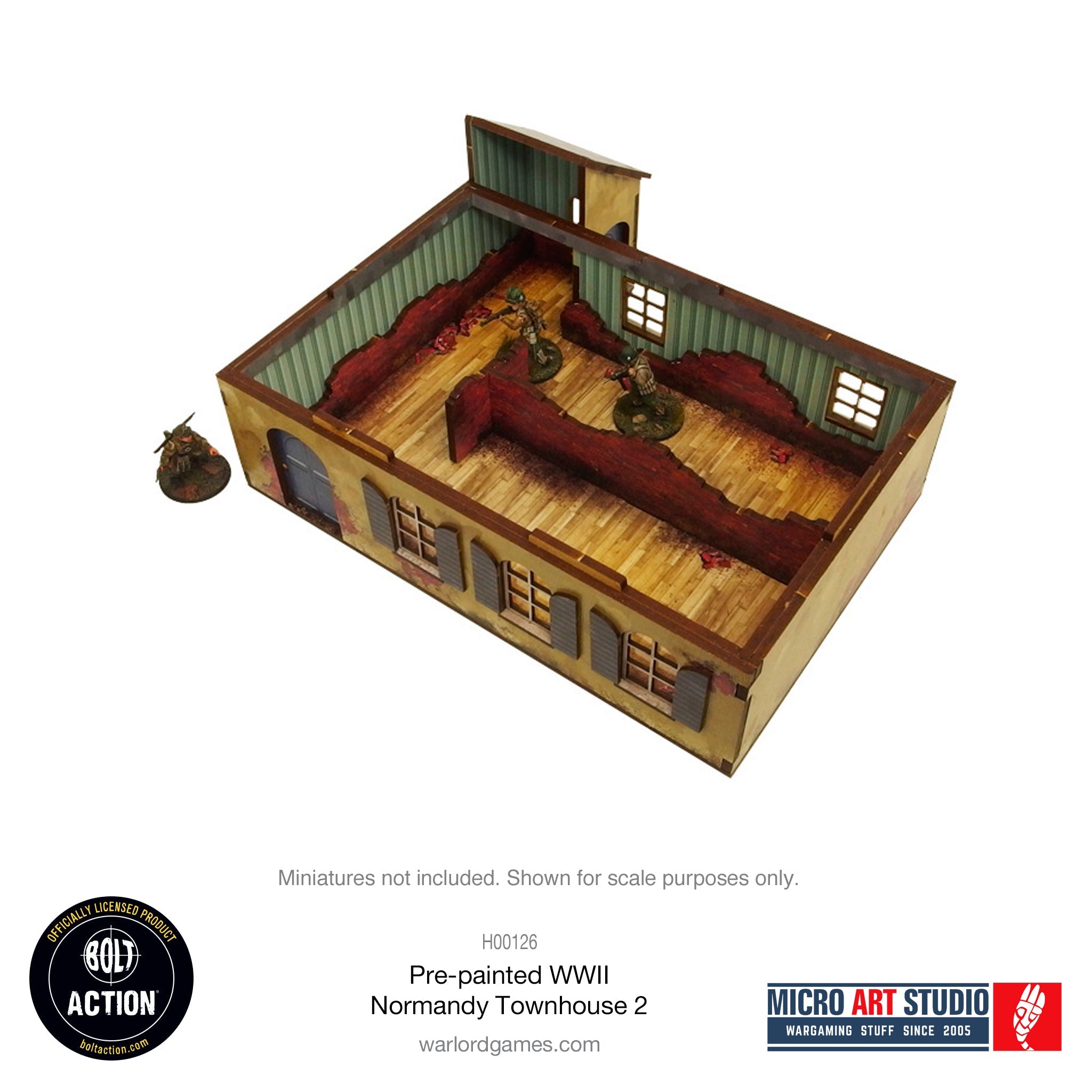 Multicolor prepainted (UV-printed) 3-level Normandy Townhouse 2 building with accessible colorful interiors, removable levels and removable ruined ground floor. Room to fit in the whole infantry squad inside. Pre-cut acrylic transparent window panes included. Option to assemble with open or closed shutters and doors.