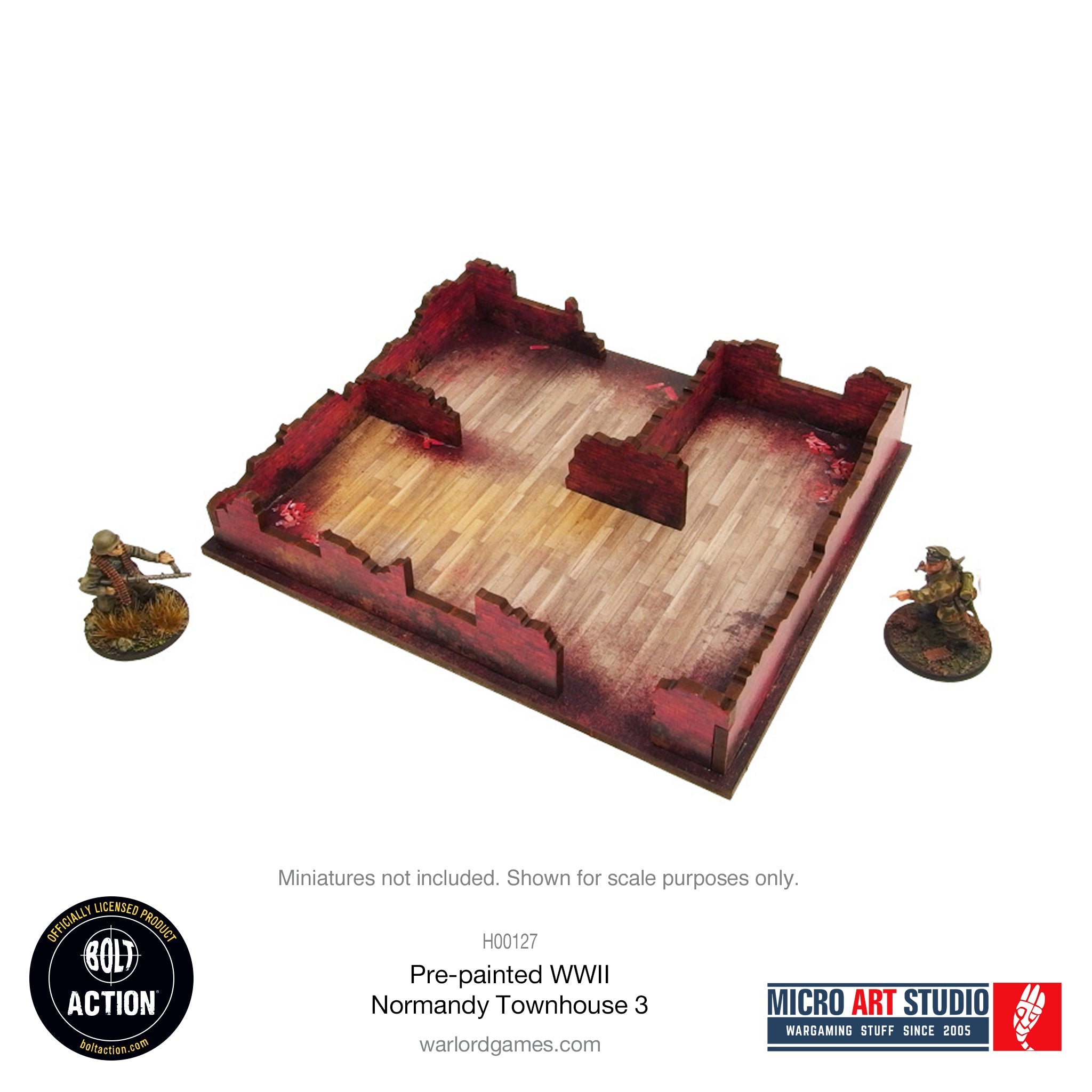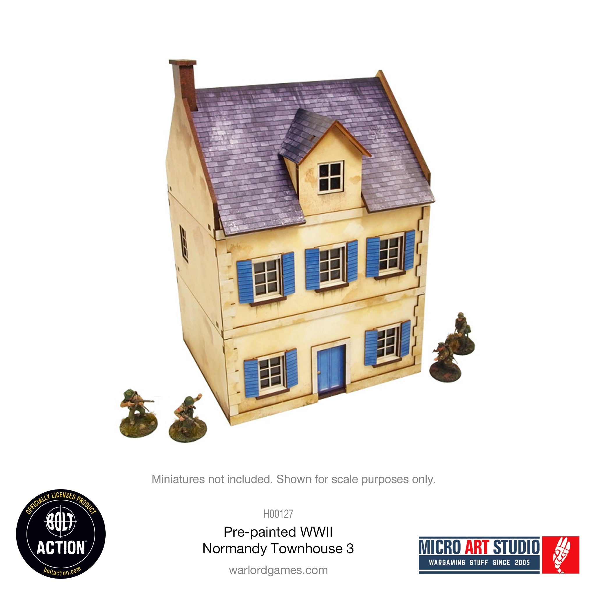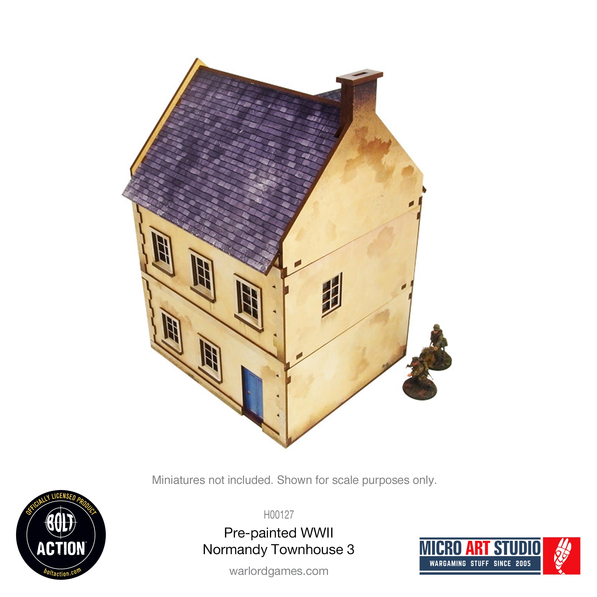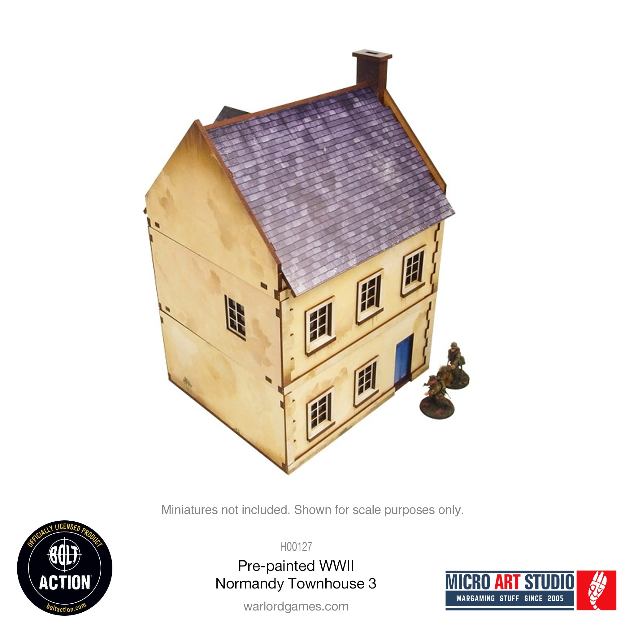 Multicolor prepainted (UV-printed) 3-level WW2 Normandy Townhouse 3 building with accessible colorful interiors, removable levels and removable ruined ground floor. Room to fit in the whole infantry squad inside. Pre-cut acrylic transparent window panes included. Option to assemble with open or closed shutters and doors.