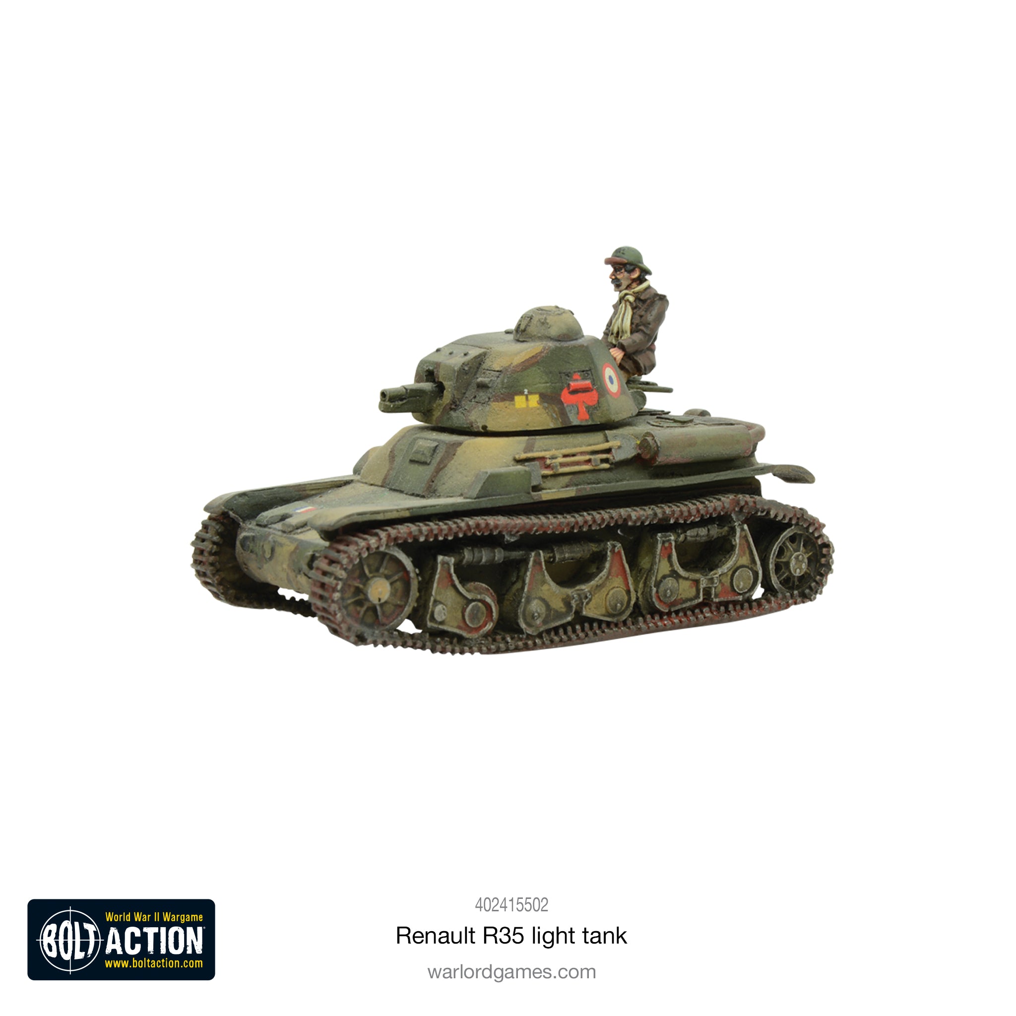 Contains one resin & metal Renault R35 light tank with metal tank crewman, stat cards, damage markers, decal sheet and order dice.