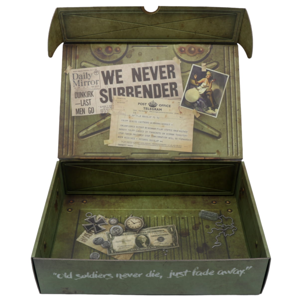 The exterior of the box is styled to resemble a WWII ammo crate, complete with realistic wear, offering a rugged, authentic feel. Inside, the theme shifts to evoke the personal side of a soldier’s journey. The interior artwork showcases war memorabilia, including faded photographs, aged newspapers, maps, and keepsakes, creating the feel of a soldier’s private collection stored away in a trusty crate.