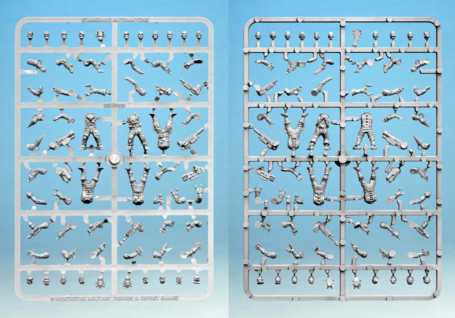 This boxed set offers enough parts to build 20 cyborg monstrosities for Stargrave that can be used to menace independent crews. These parts can also be combined with components from other Stargrave boxed sets to create characters with cybernetic implants or to add even more variety to an automaton horde.