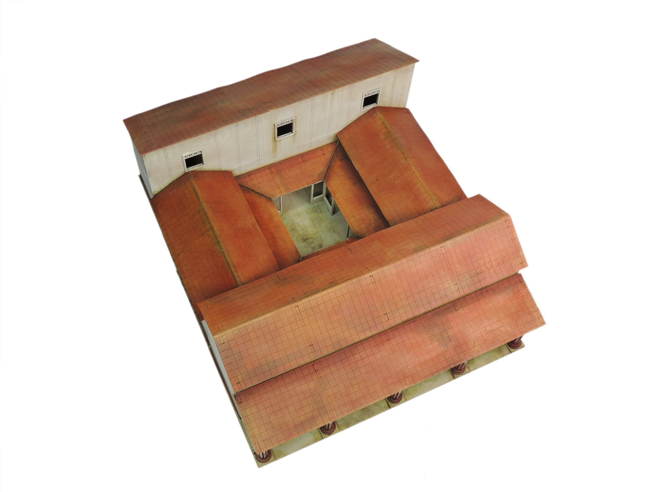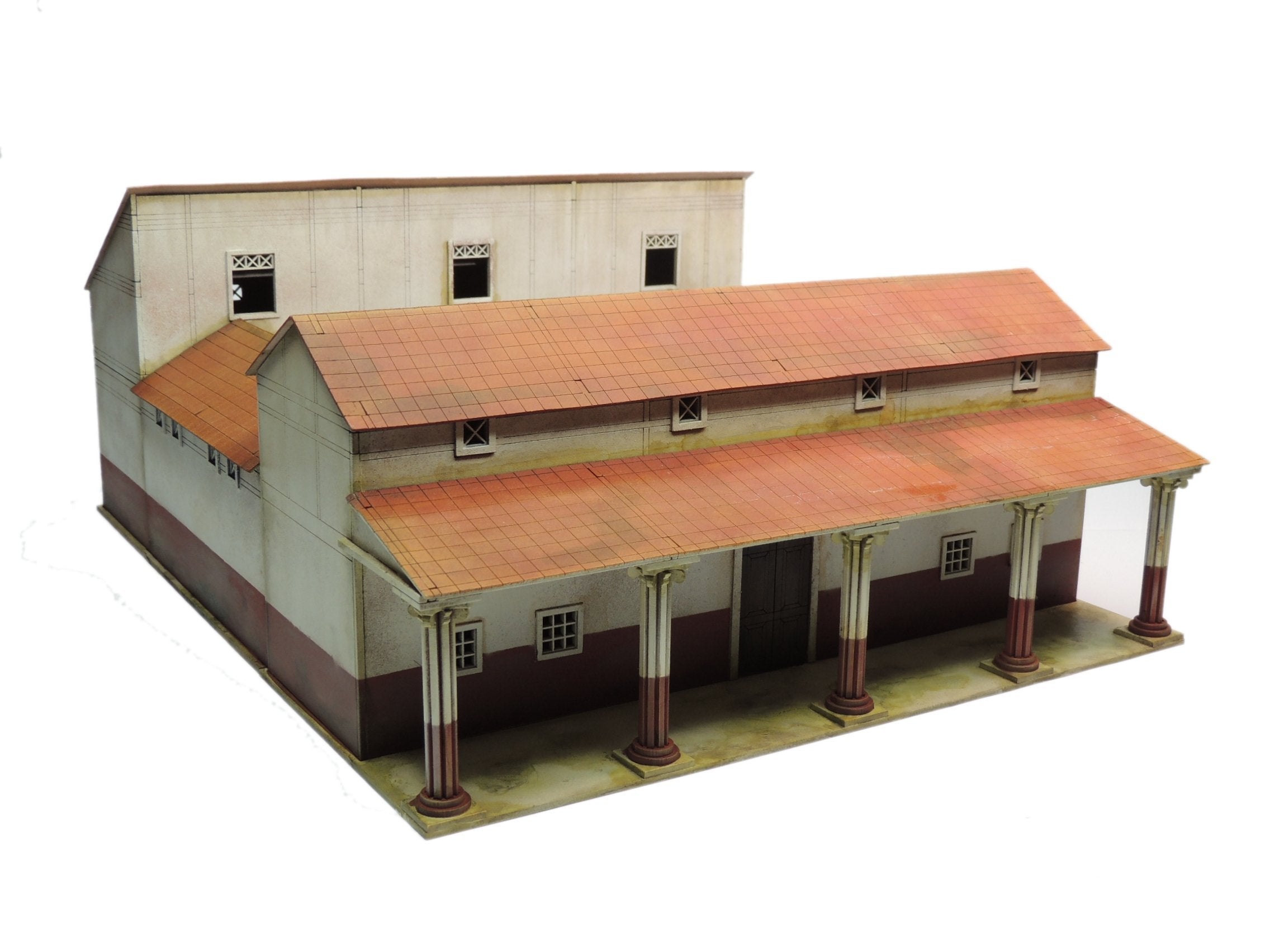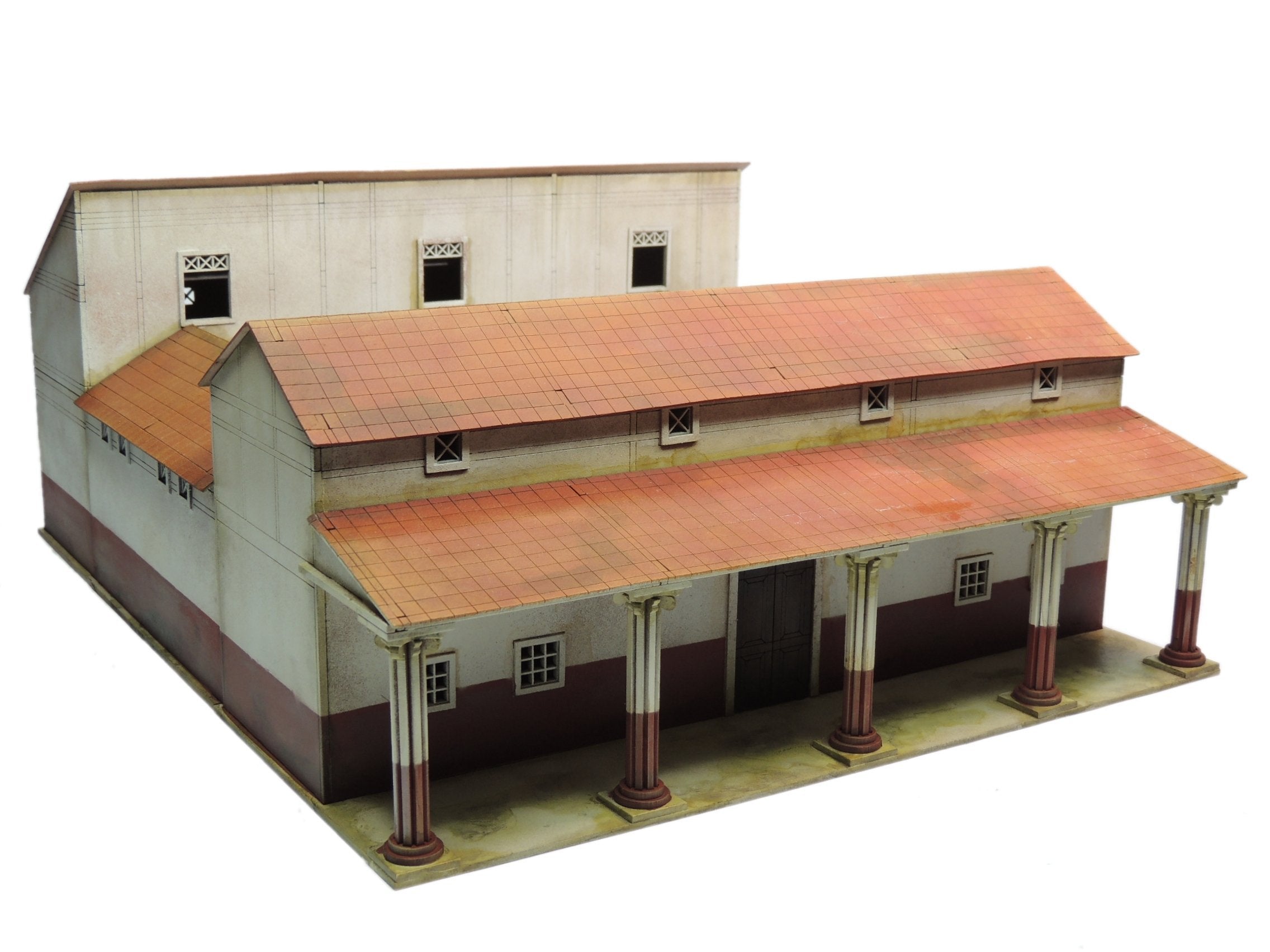 The terrain is made from MDF and is part of Sarissa Precisions Streets of Rome range. 364mm x 295mm x Max height Front roof 125mm, middle roof sections 92mm and rear roof 150mm