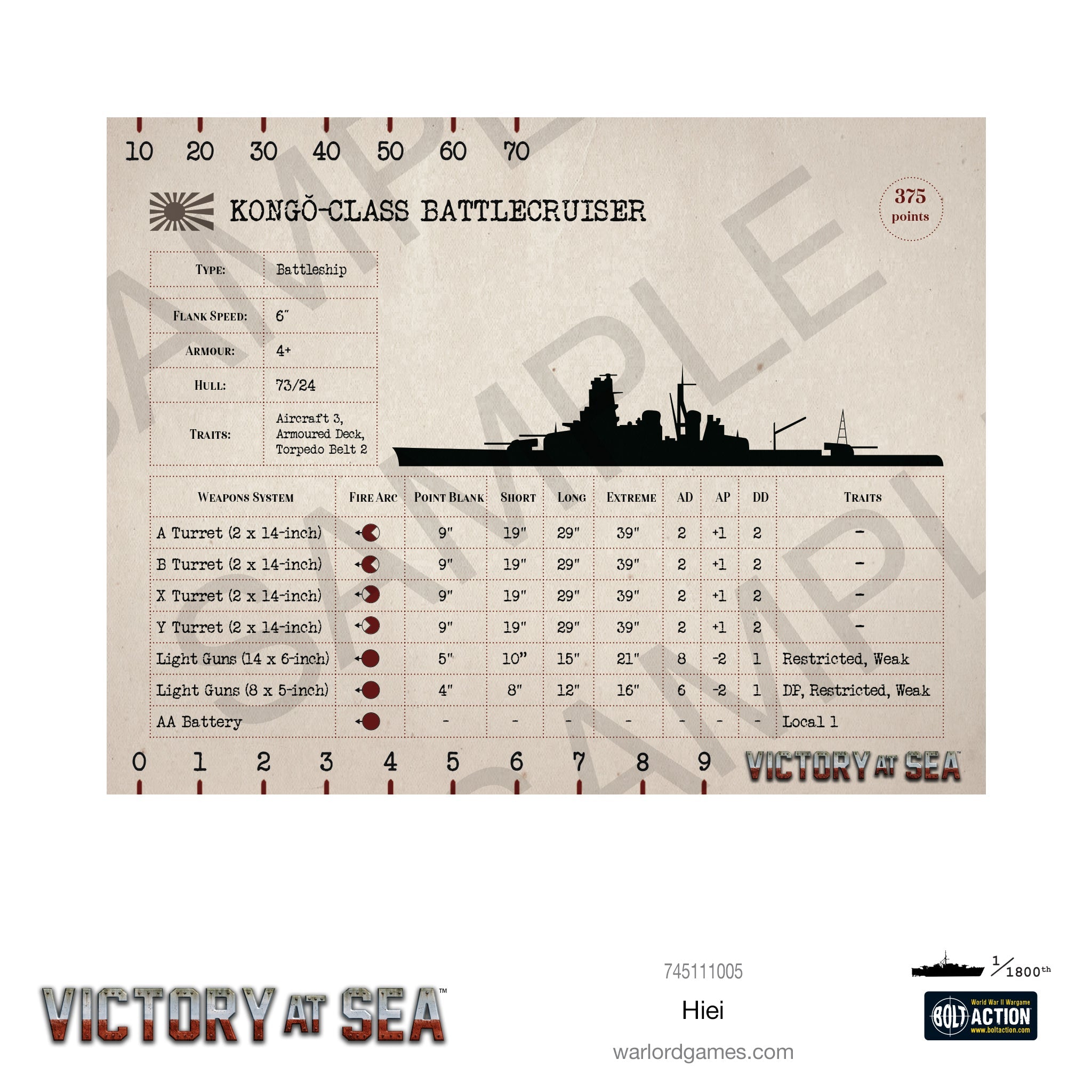 Hiei saw extensive action in the Pacific at Kavieng, Rabaul, the Gilbert & Marshall Islands, Midway, Guadalcanal and the Santa Cruz islands amongst others. She was lost off Guadalcanal – disabled after taking hits from fifty or more shells, and finally sunk by air-launched torpedoes.